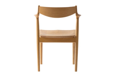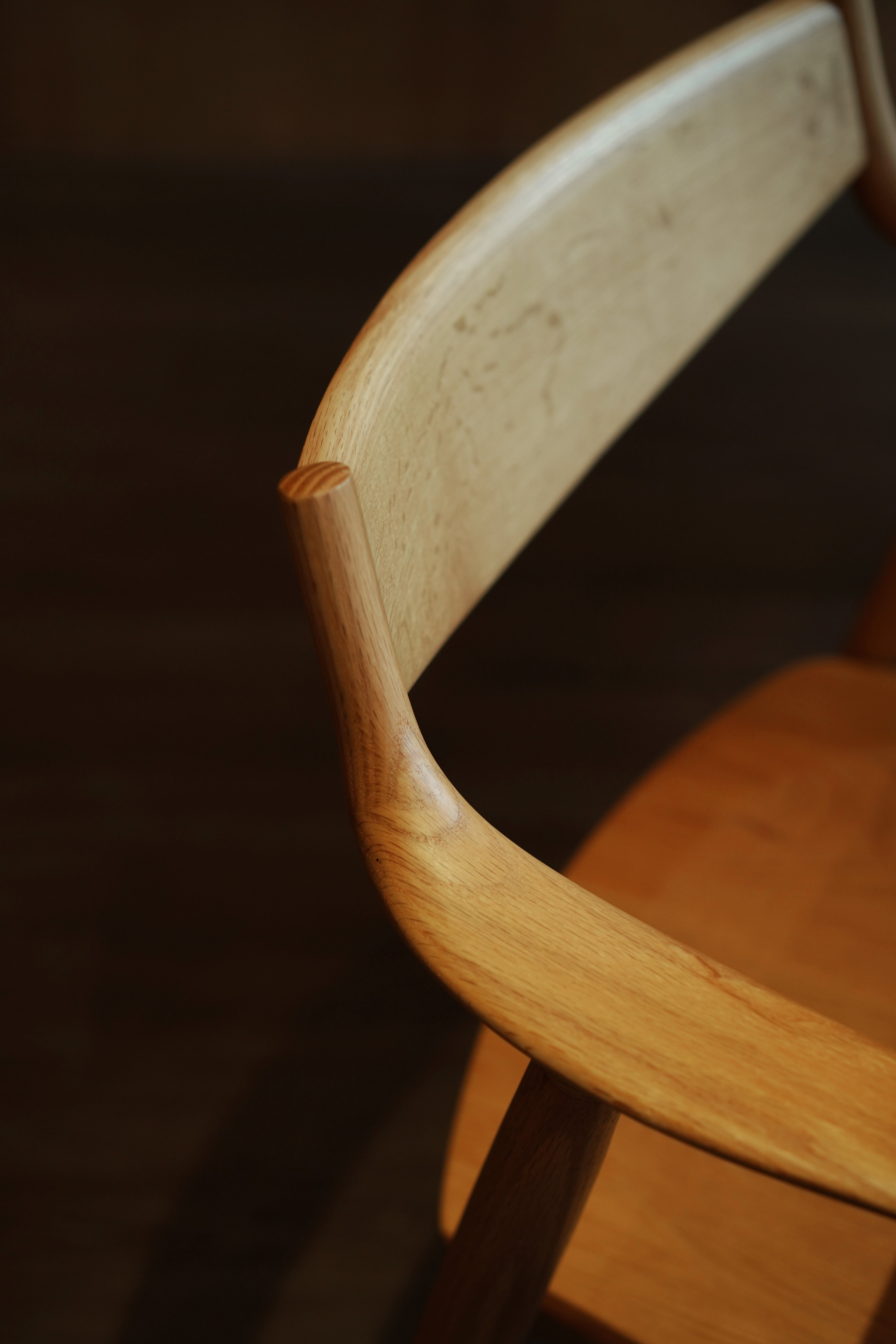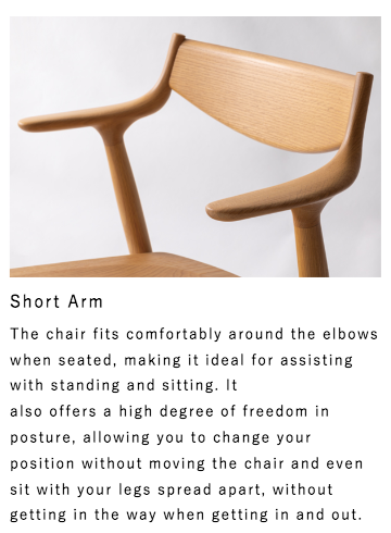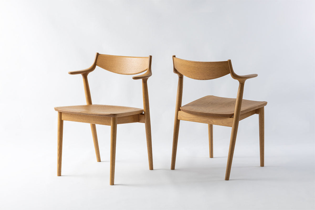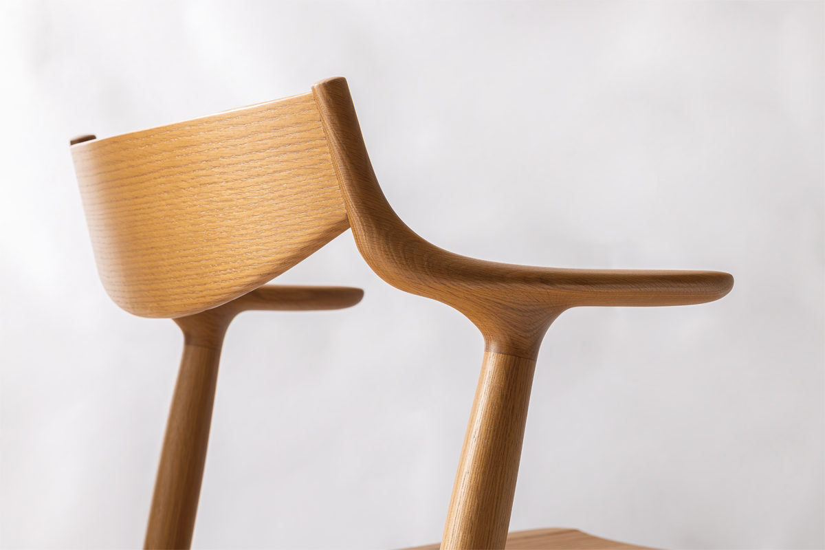 此系列餐椅充分展現了濱本工坊工匠們精湛的技藝,例如彎曲的木質靠背和曲線優美的有機扶手。