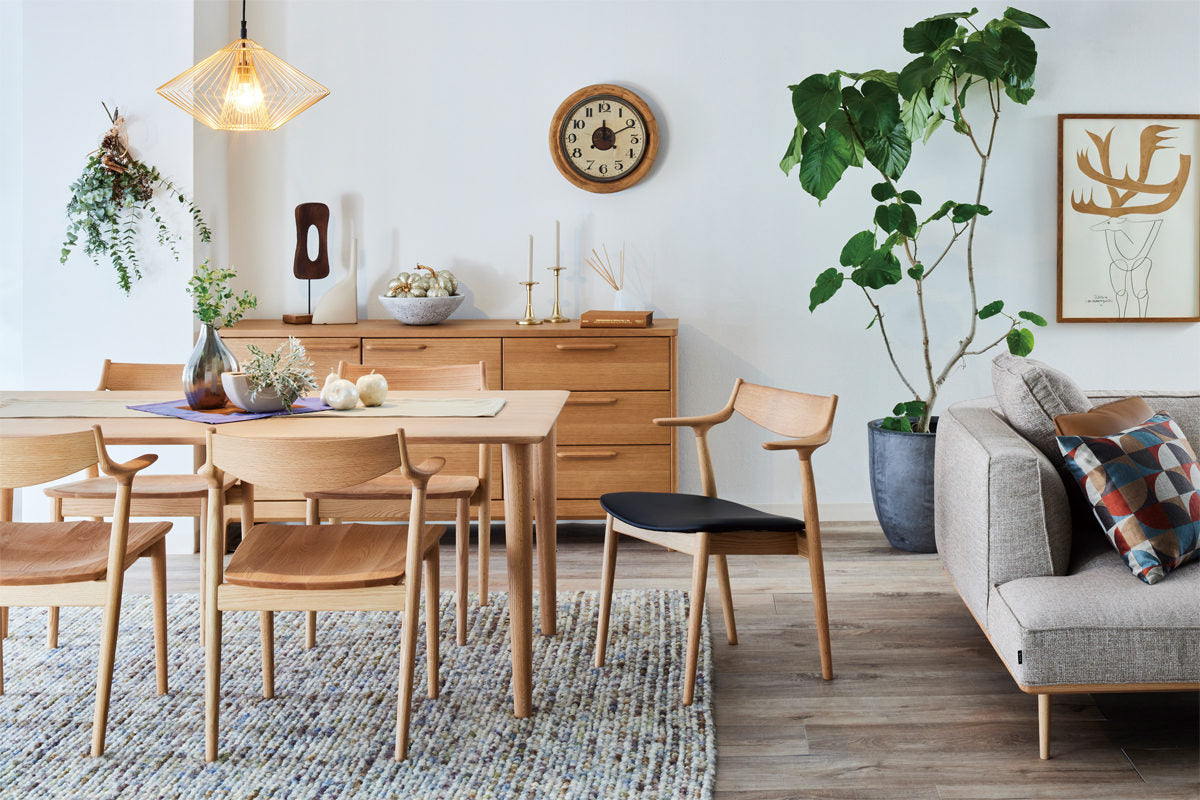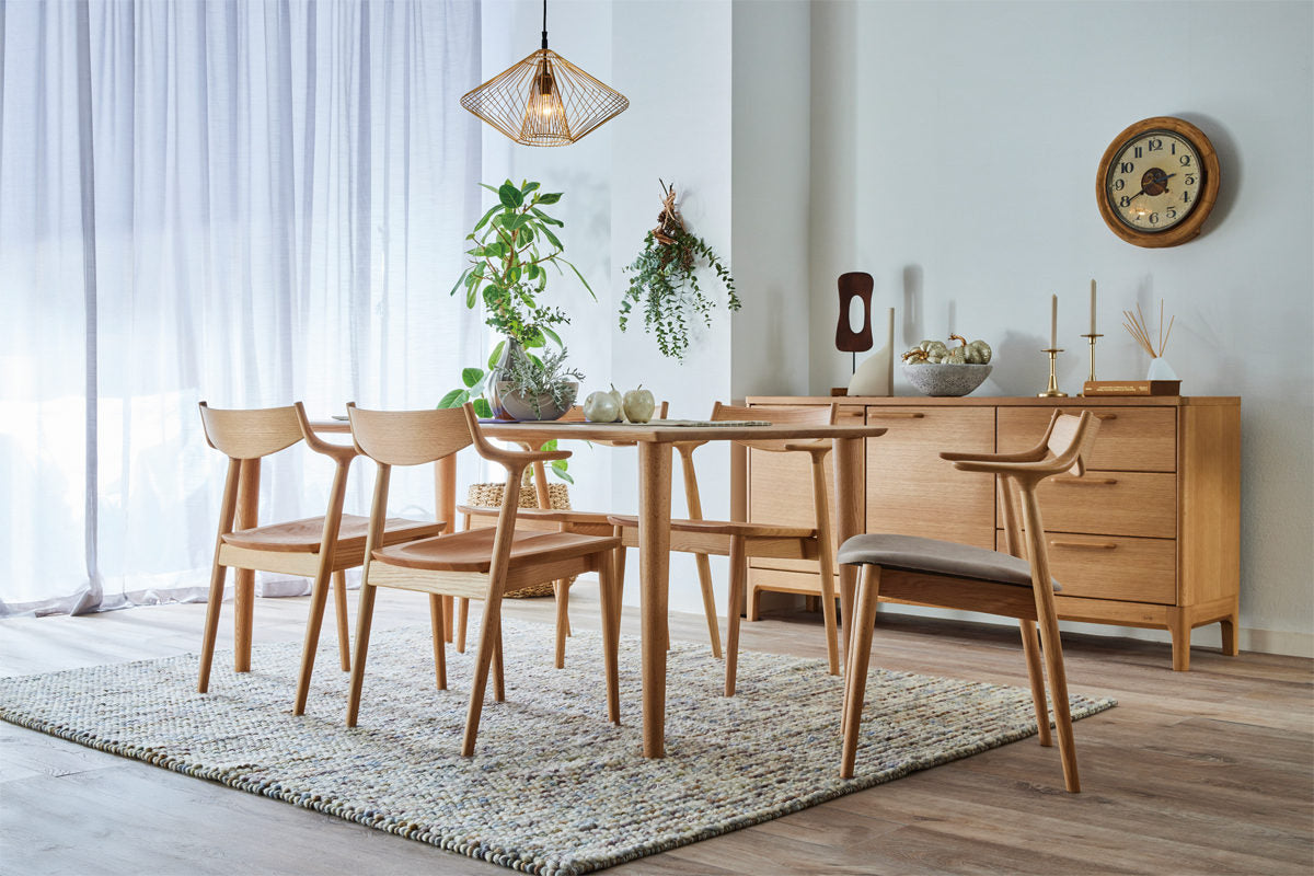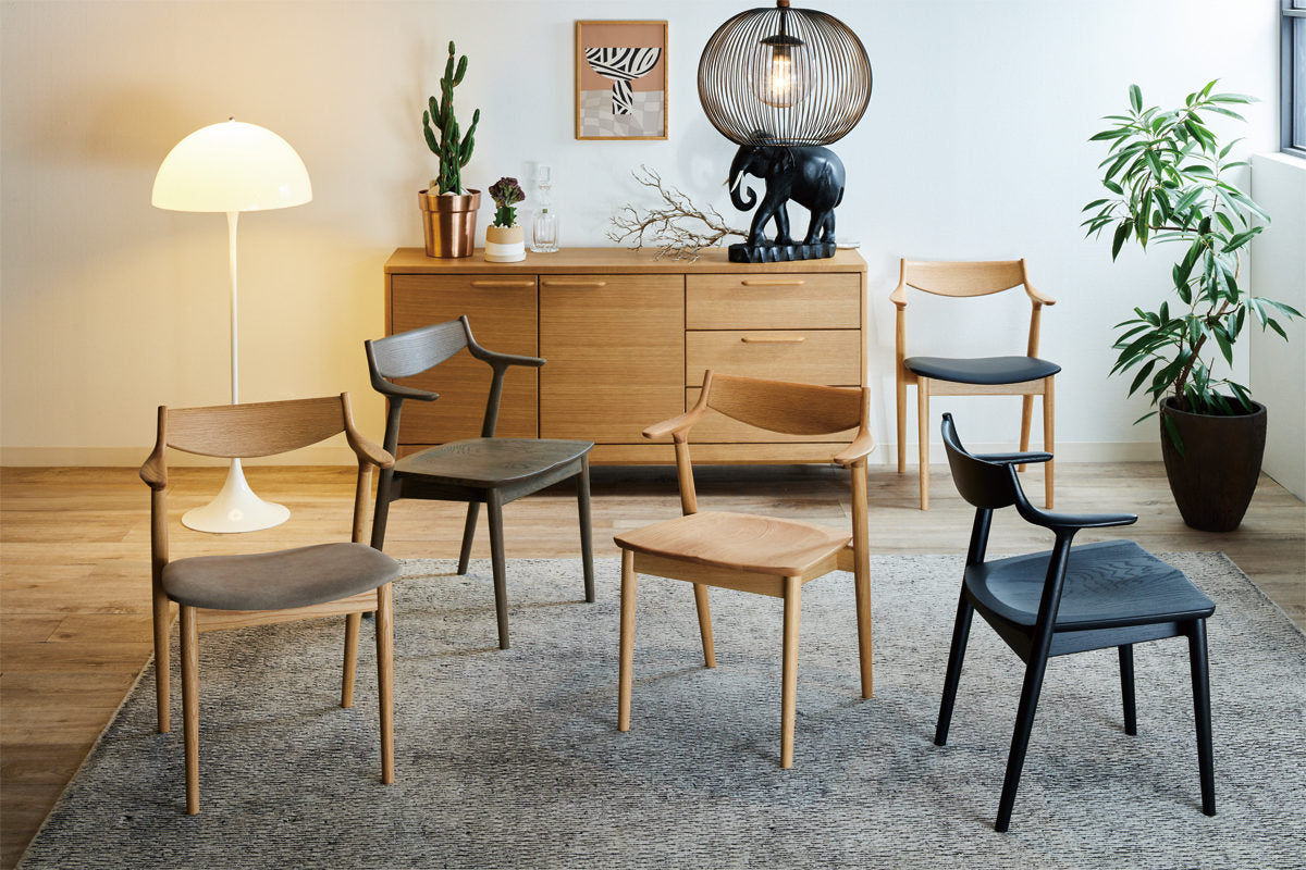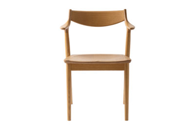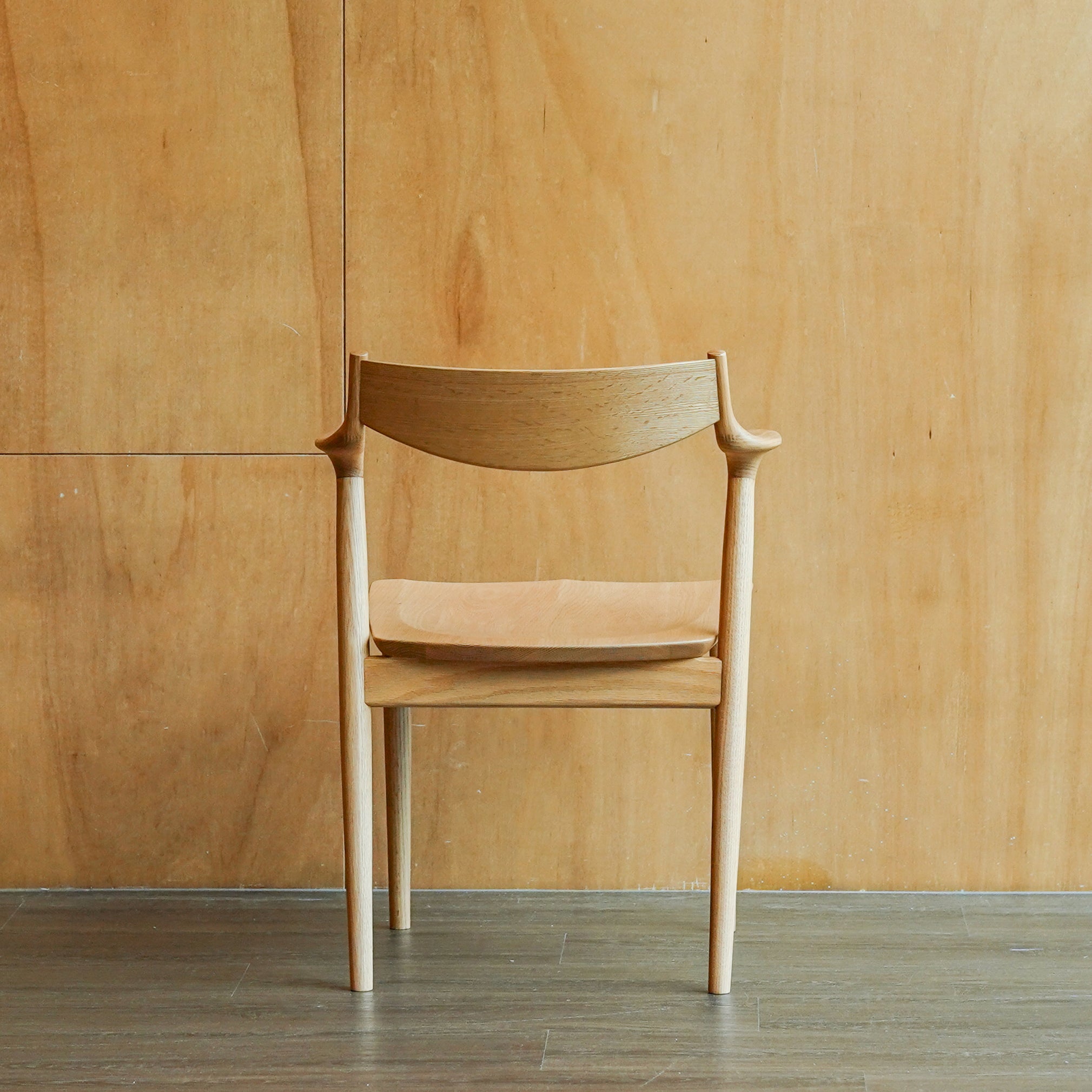 此系列餐椅充分展現了濱本工坊工匠們精湛的技藝,例如彎曲的木質靠背和曲線優美的有機扶手。