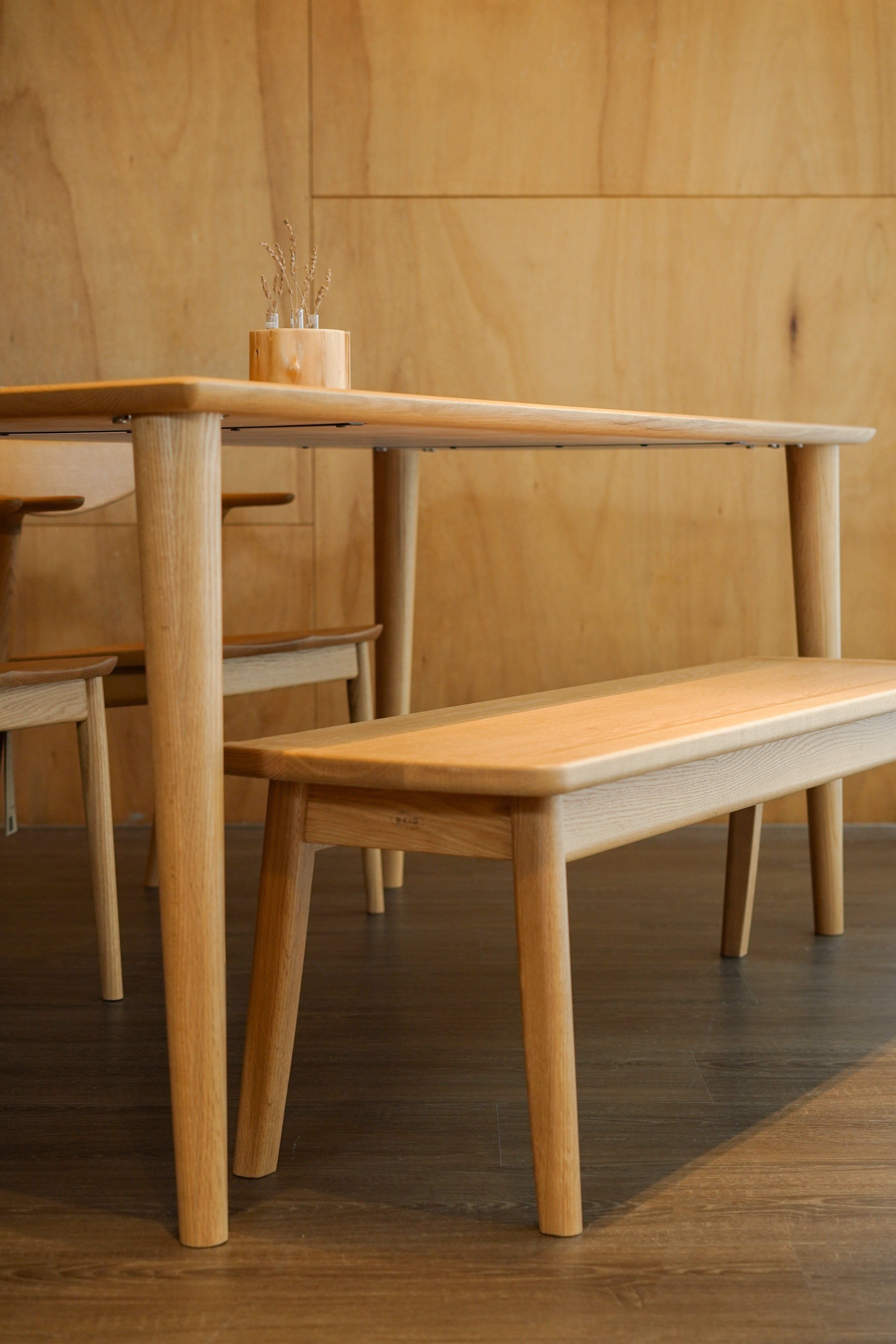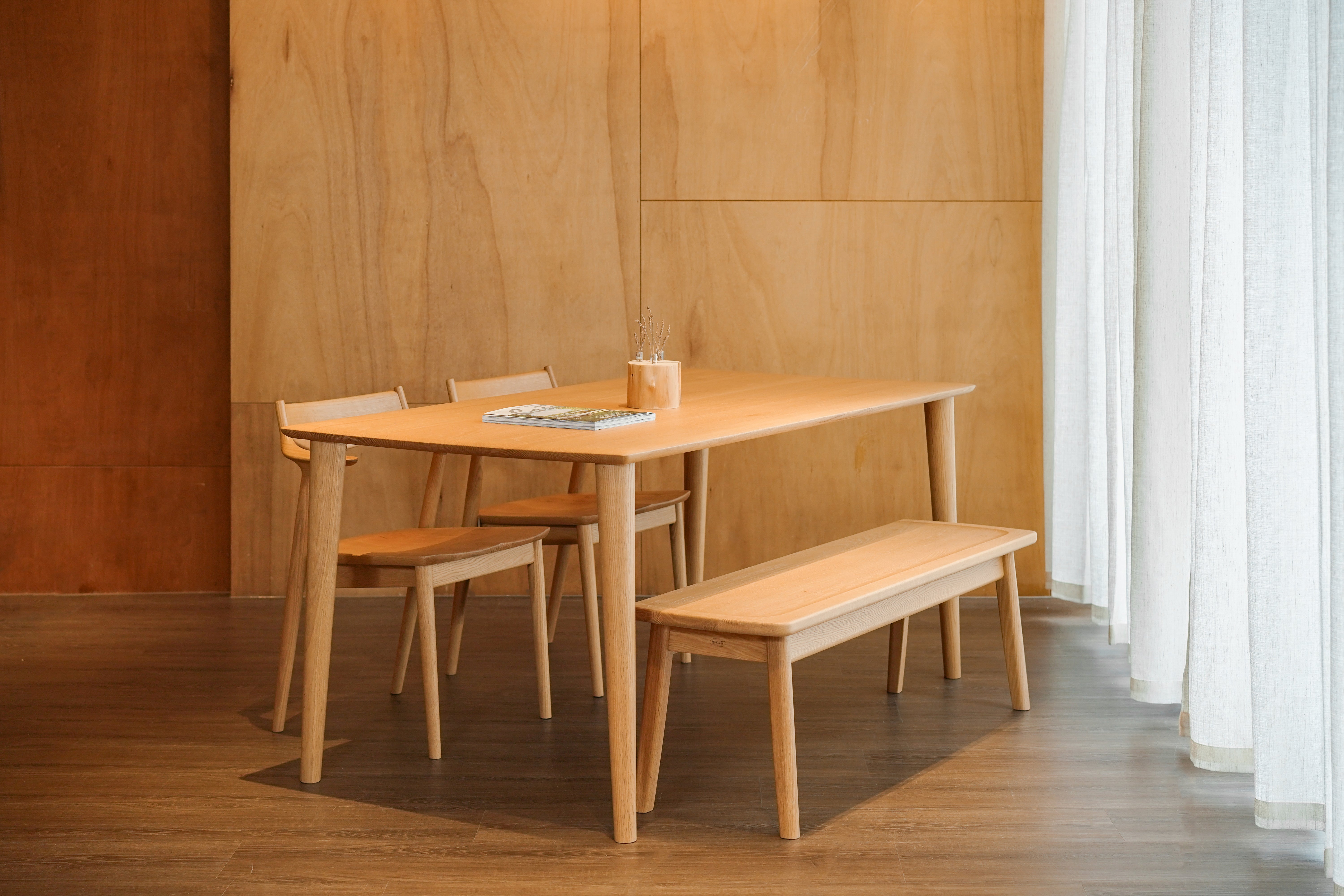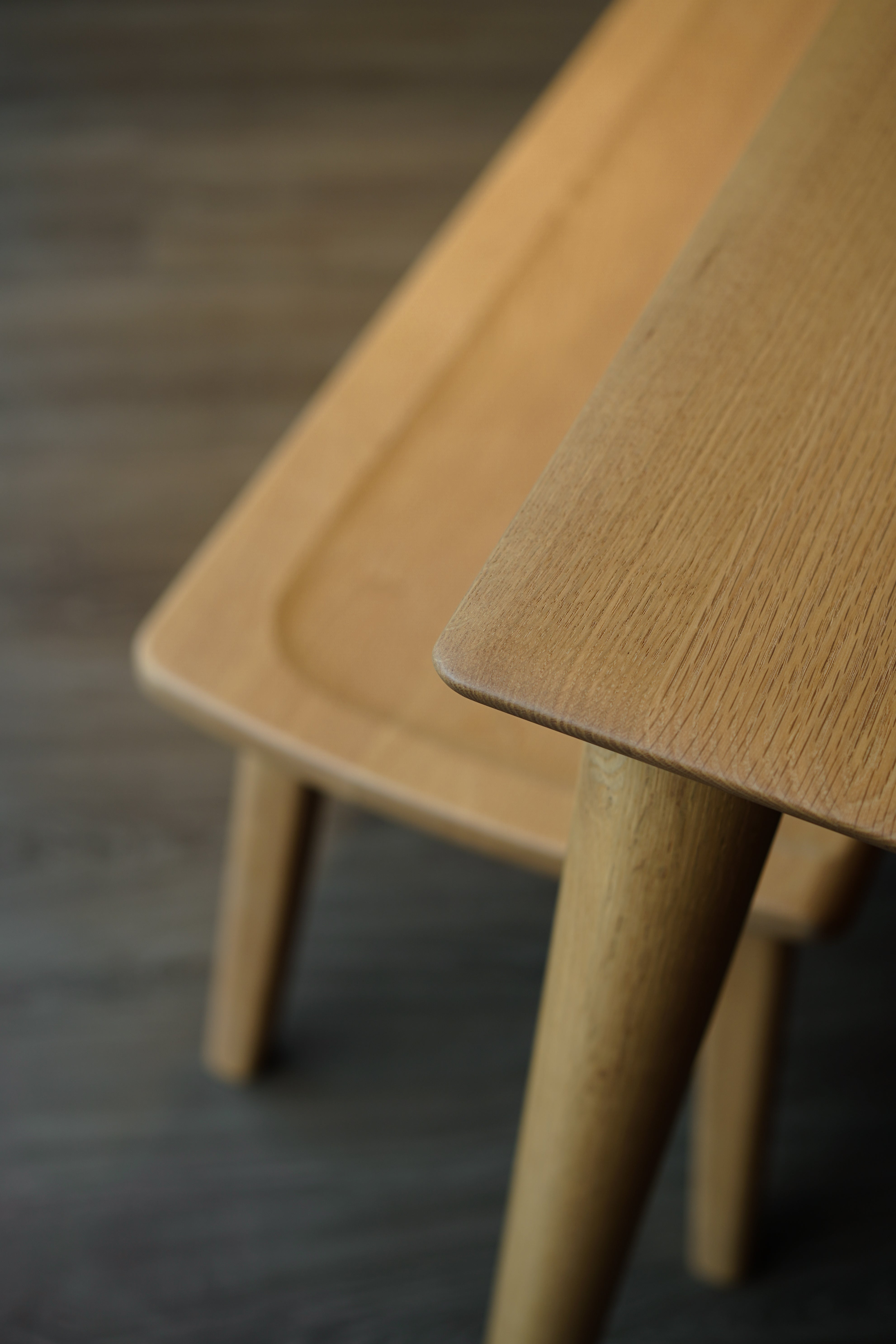 帶有波浪形處理的桌子,每一張都經過工匠以手工加工處理,讓您享受實心橡木的原始特性,使每一張餐桌都獨一無二。枱腳可根據個人喜好向內或向外安裝。枱腳獨特的設計令你有足夠空間給腳部伸延。頂板的正面及背面均塗有UV塗層,使其具有出息的耐刮、耐污及耐熱性。